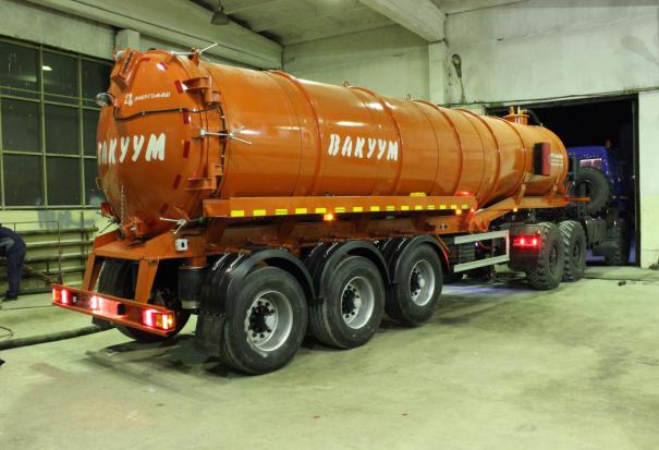 Полуприцеп-цистерна для сбора нефти, 24 м3, 1 секция, круглого переменного сечения, открывающееся заднее днище, рамный, 2 оси PLT, рессорная подвеска, ССУ 1500, односкатный, шины 425/85R21, насос ВР-8/3